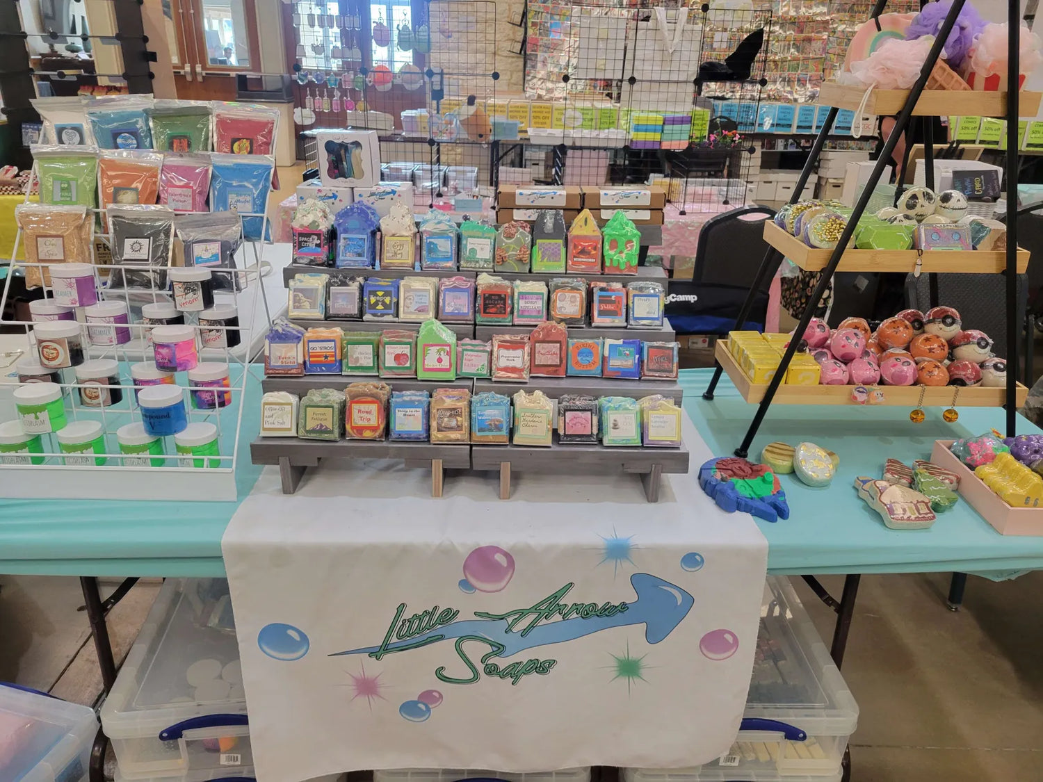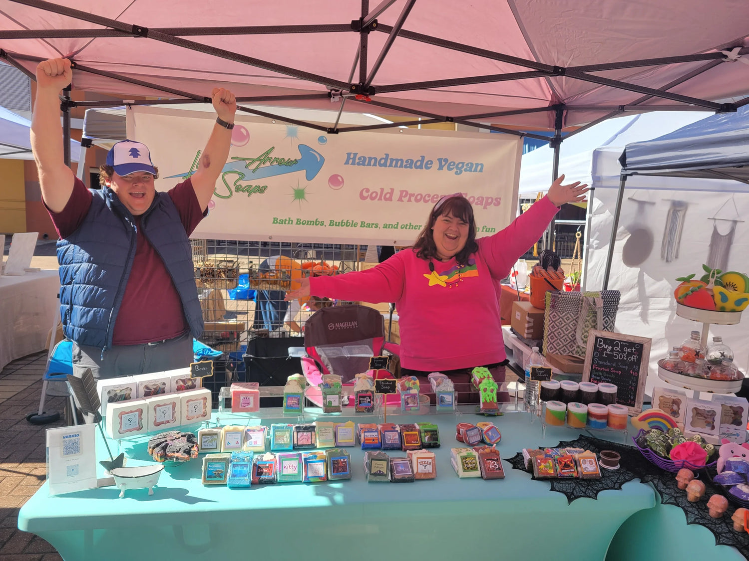 We are Michelle and Zac, a husband and wife who never really grew up. To keep our minds occupied during lockdown in July 2020, we decided to learn how to make our own cold process soap and quickly fell in love with the process. By September, we had made so much soap that we could no longer feasibly use it all ourselves, so we got ourselves a tent and began sharing our creations with the world. We have only grown since then, and continue to find new inspirations, so there will always be something new on the table!