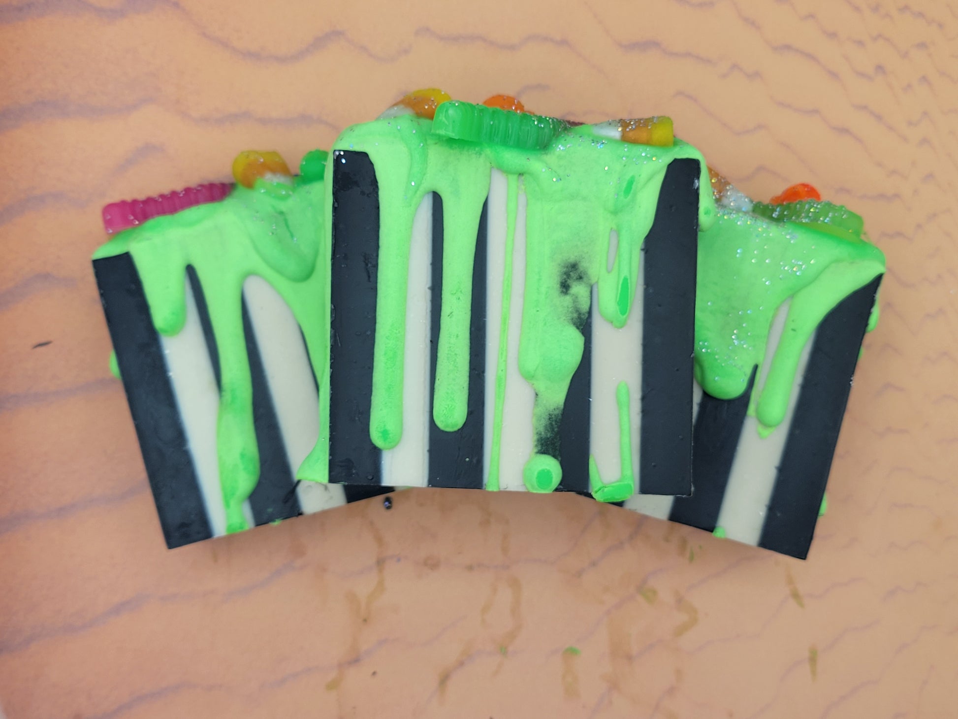 Olive Oil, Coconut Oil, Water, Sodium Hydroxide, Castor Oil, Synthetic Fragrance Oil, Cosmetic Grade Mica, Salt, Black Oxide, Glycerin Melt and Pour, BioGlitter